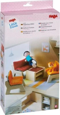 Hier nimmt man gerne Platz Die Puppenhaus-Möbel Wohnzimmer aus der HABA-Serie Little Friends sind liebevoll gestaltet und verwandeln jedes Haus der süßen Biegepuppen in einen Ort purer Gemütlichkeit. Das Sofa und die beiden Sessel sind farblich unterschiedlich gestaltet und haben einen wunderbar weichen Bezug. Hier können die Little Friends bequem sitzen. Ein kleiner Tisch dient zum Abstellen von Sachen wie Getränken oder Büchern. Alle Möbel sind robust verarbeitet und versprechen lange Spielfreude. Die Little Friends-Puppenhaus-Möbel Wohnzimmer animieren Kinder ab 3 Jahren zu kreativen Rollenspielen.