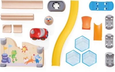 Das Spielen mit der Kullerbü Spielbahn „Crashtext“ von Haba macht Kindern so viel Spaß! Die Spielbahn zusammenzusetzen ist eine tolle Herausforderung und mit dem fertigen Spielzeug lassen sich viele vergnügte Stunden verbringen. Der Stuntman „Steve“ flitzt in seinem Auto die Stecke entlang und schleudert mit voller Wucht gegen die Prismasteine – Crashtext bestanden!