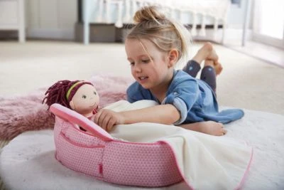 Die Lieblingspuppe soll mit zu den Großeltern oder zu den Freunden? Ausflüge und Reisen sind mit der Puppentragetasche Rosarot von HABA ein besonders angenehmes Vergnügen. Puppentragetasche Rosarot ab 18 Monaten kann als Puppenbett oder Tragetasche genutzt werden mit weicher Decke ideal für alle HABA-Stoffpuppen Einfach die Puppe in das rosarote Kuschelnest legen und mit der weiche Decke zudecken. So hat es die Puppe schön gemütlich! Dank der gut greifenden Tragegriffe und des geringen Gewichts lässt sich die Tasche leicht überallhin mitnehmen. Auch als Puppenbett für daheim eignet sich die HABA-Puppentragetasche Rosarot wunderbar, denn sie ist ein hübscher Schlafplatz für den Liebling und beschert ihm süße Träume. Die Tragetasche ist daher eine tolle Geschenkidee für alle Puppeneltern!