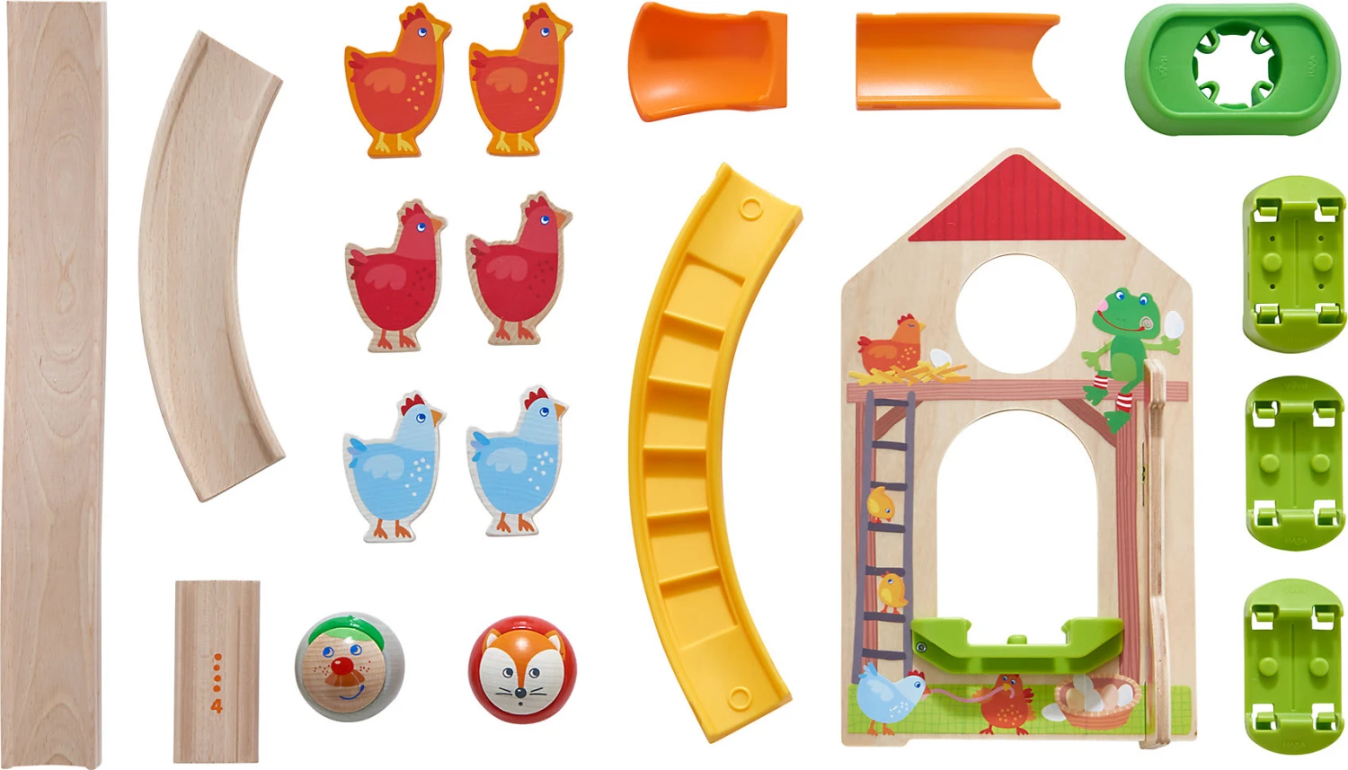 1 Kulisse Scheune, 1 Rampe, 1 Säule, 1 Kurve, 1 Dominotreppe, 6 Dominosteine Huhn, 4 Verbindungselemente, 1 Startrampe, 1 Abfahrtsrampe, 1 Kugel Bauer Björn, 1 Kugel Fuchs Frederik.