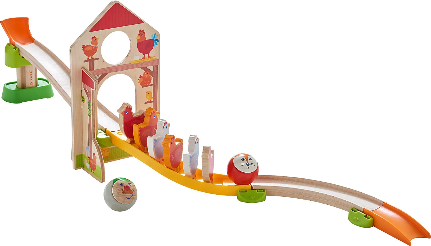 HABA Kullerbü – Kugelbahn Hühner-Domino. Nanu, ein Huhn in Pelz? Oh nein – Fuchs Frederik ist im Hühnerstall Bauer Björn kullert sofort dorthin, um seinen Hennen zur Hilfe zu kommen. Die feinen Damen schauen zu, wie sich Fuchs und Bauer ein Rennen durch das Scheunentor liefern. Wer erreicht zuerst die Hühnerleiter und schubst die Dominosteine um?