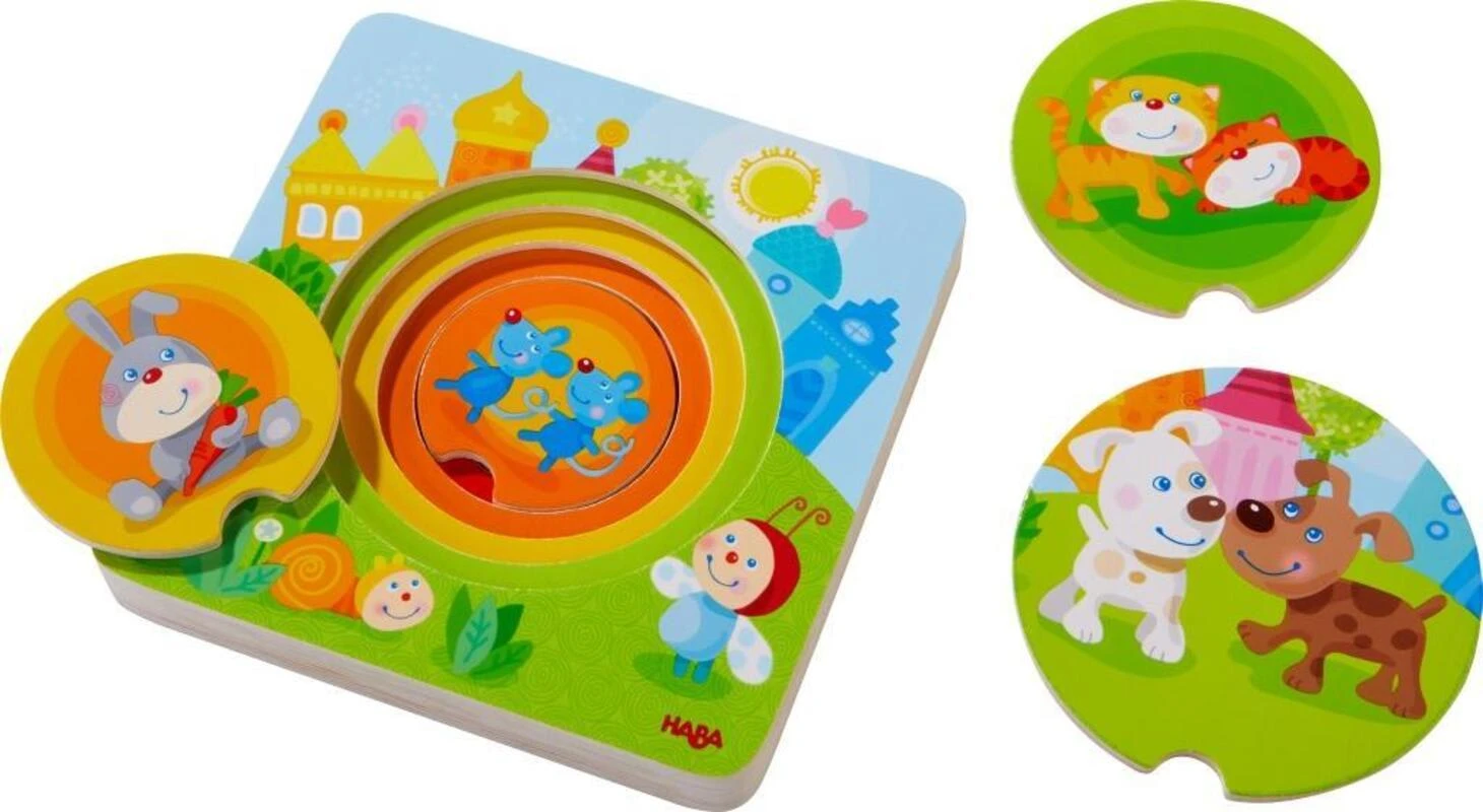 Die niedlichen Tierkinder treffen sich auf der Wiese vor dem Schloss zum Spielen. Wer mag ihnen dabei zusehen? Die einzelnen Puzzleteile werden übereinander in die Aussparungen gepuzzelt. Das macht Spaß und schult die Feinmotorik. Material: Sperrholz. Maße: 15 x 15 cm. 1 Puzzlebrett, 5 Puzzlescheiben.